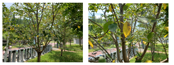 除此之外,筆者觀察到,長(zhǎng)三角地區(qū)許多早櫻在受到高溫脅迫,出現(xiàn)樹(shù)勢(shì)衰弱、葉片枯黃的情況,各種病菌侵入,嚴(yán)重的出現(xiàn)了葉片穿孔。