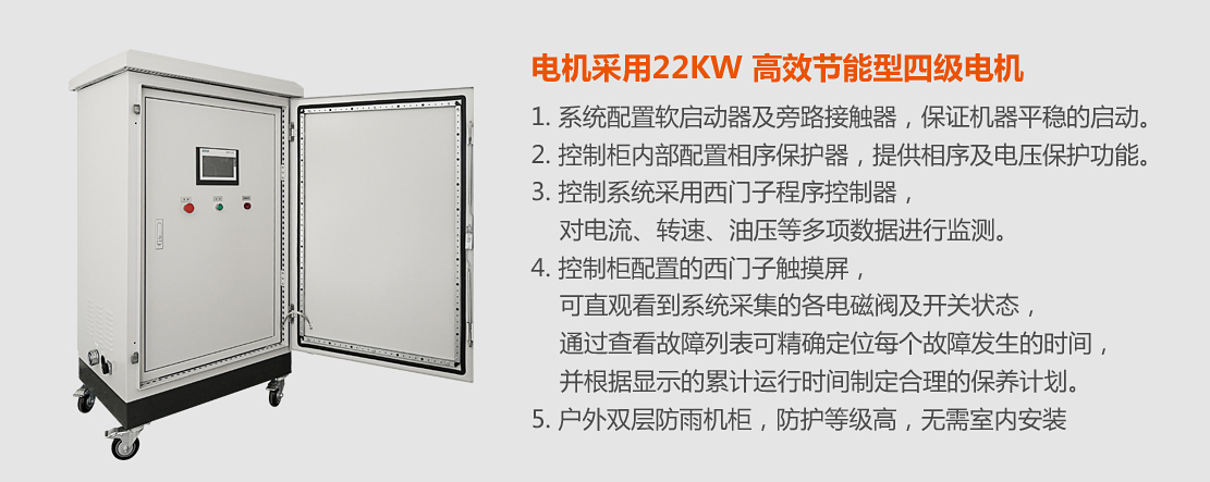 16cm電動(dòng)粉碎機(jī),配置380V22kW高效節(jié)能型電機(jī)。戶外雙層防雨機(jī)柜,防護(hù)等級(jí)高,無(wú)需室內(nèi)安裝;配置西門子觸摸屏,可直觀看到系統(tǒng)的運(yùn)行狀況。