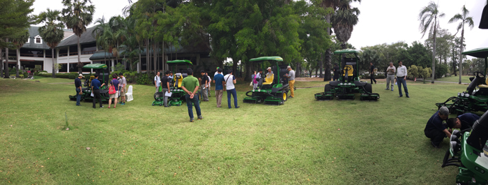 三天的培訓(xùn),時(shí)間安排緊湊有序,每天早晨七點(diǎn)準(zhǔn)時(shí)乘車出發(fā)去培訓(xùn)地點(diǎn)。前兩天培訓(xùn)安排在Lakewood高爾夫球場,最后一天的服務(wù)培訓(xùn)則安排在迪爾培訓(xùn)中心。首先從A系列最先進(jìn)技術(shù)Tech-control系統(tǒng)開始模擬操作學(xué)習(xí),通過顯示屏操控、設(shè)定、了解整車的運(yùn)行、剪草、維修、診斷等功能。Tech-control可視界面,具備指尖控制功能,不僅有助于實(shí)現(xiàn)出色的剪草效果,還可提高機(jī)器的工作效率。然后我們分組圍繞機(jī)器,進(jìn)行最直觀的實(shí)機(jī)學(xué)習(xí)和討論,在輔導(dǎo)老師的提示下,識別并列出每款A(yù)系列機(jī)器的新增功能、改進(jìn)及變化之處。之后老師通過一張張機(jī)器部位卡片和實(shí)際部件,清晰明了地講解每個(gè)機(jī)型的每個(gè)改進(jìn)部位,不僅讓銷售人員們對機(jī)器的部件有更加清楚地認(rèn)知,而且對部件的位置、形狀和區(qū)別,都有了深刻的印象,值得我們學(xué)習(xí)借鑒。最后根據(jù)這兩天的學(xué)習(xí),每個(gè)人都親自上車實(shí)機(jī)演示,上車前設(shè)置好剪草、運(yùn)輸、轉(zhuǎn)彎速度,手指輕按Tech-control操作平臺按鈕,即可感受自動巡航功能帶來的前所未有的操作員感受。通過課堂理論的學(xué)習(xí),以及室外場地的實(shí)機(jī)操作,使我們對A系列的新產(chǎn)品了解的更加透徹。在總結(jié)會上,老師準(zhǔn)備了很多A系列新功能的小標(biāo)題,通過游戲傳球的方式,讓大家利用小標(biāo)題展開話題進(jìn)行講解,課堂氣氛生動活潑,學(xué)員參與話題積極踴躍,而李國強(qiáng)對7200A在球場意外停機(jī)處理辦法的細(xì)致全面的講解,贏得了學(xué)員們熱烈的掌聲。