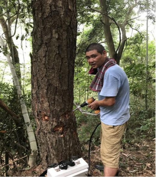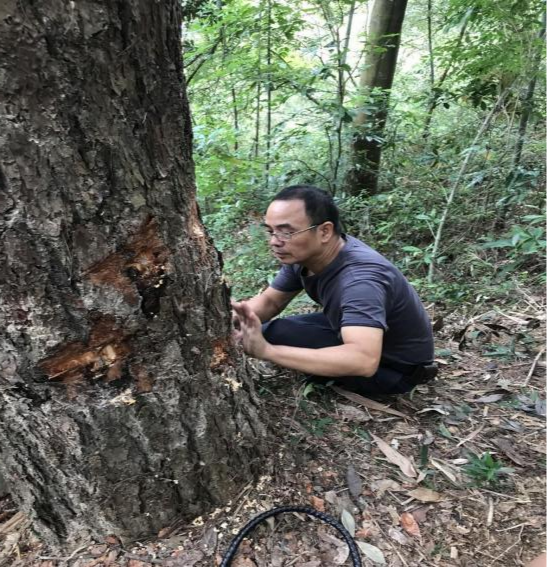 2022年9月8號,汪洋帶上綠友電動樹干打孔注藥機、木塞、藥品以及相應(yīng)工具。早上五點鐘從廣州出發(fā),舟車勞頓數(shù)百公里,踏上拯救坪坑參天古樹的旅程。趕到潮州坪坑村,村委部文主任領(lǐng)路去村后的山上查看古松樹。在看過所有的古樹以后,根據(jù)松樹的枯葉癥狀,樹木呈現(xiàn)出來的病癥,最后診斷確認(rèn)是松材線蟲危害所致。汪洋將診斷結(jié)果以及解決方案告知文主任,并通過電話向省林業(yè)部領(lǐng)導(dǎo)作匯報,得到批復(fù)后立即展開作業(yè)。