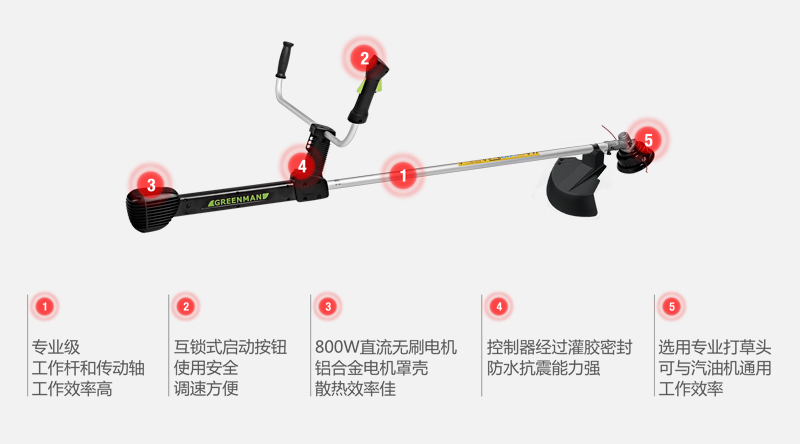 GREENMAN 電動割灌割草機(jī)從國內(nèi)綠化管理的實(shí)際情況出發(fā),選用800W大功率直流無刷電機(jī)和大直徑打草繩。在實(shí)現(xiàn)電動化的同時,又能滿足綠化養(yǎng)護(hù)的高效率。